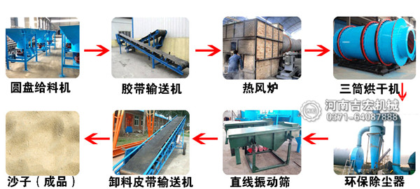 石英砂先經(jīng)過圓盤給料機(jī)被均勻地送入到皮帶輸送機(jī)之上,之后通過流沙管進(jìn)入到烘干機(jī)內(nèi)部,熱風(fēng)爐內(nèi)燃料的燃燒產(chǎn)生的熱量在抽風(fēng)機(jī)的作用下進(jìn)入到主機(jī)內(nèi)與沙子進(jìn)行接觸,完成熱量的傳遞,快速蒸發(fā)水分。我公司生產(chǎn)的沙子烘干機(jī)是三回程密封結(jié)構(gòu),能夠很好的降低熱量的散失,提高熱效率。干燥之后的沙子輸送到直線振動篩進(jìn)行篩分,之后被提升機(jī)送入儲料罐進(jìn)行儲存或者進(jìn)行打包裝袋。在接料斗的上部是排放工藝流程之中的塵土等,經(jīng)過除塵系統(tǒng)處理之后,能夠很好的達(dá)到環(huán)保的目的。
